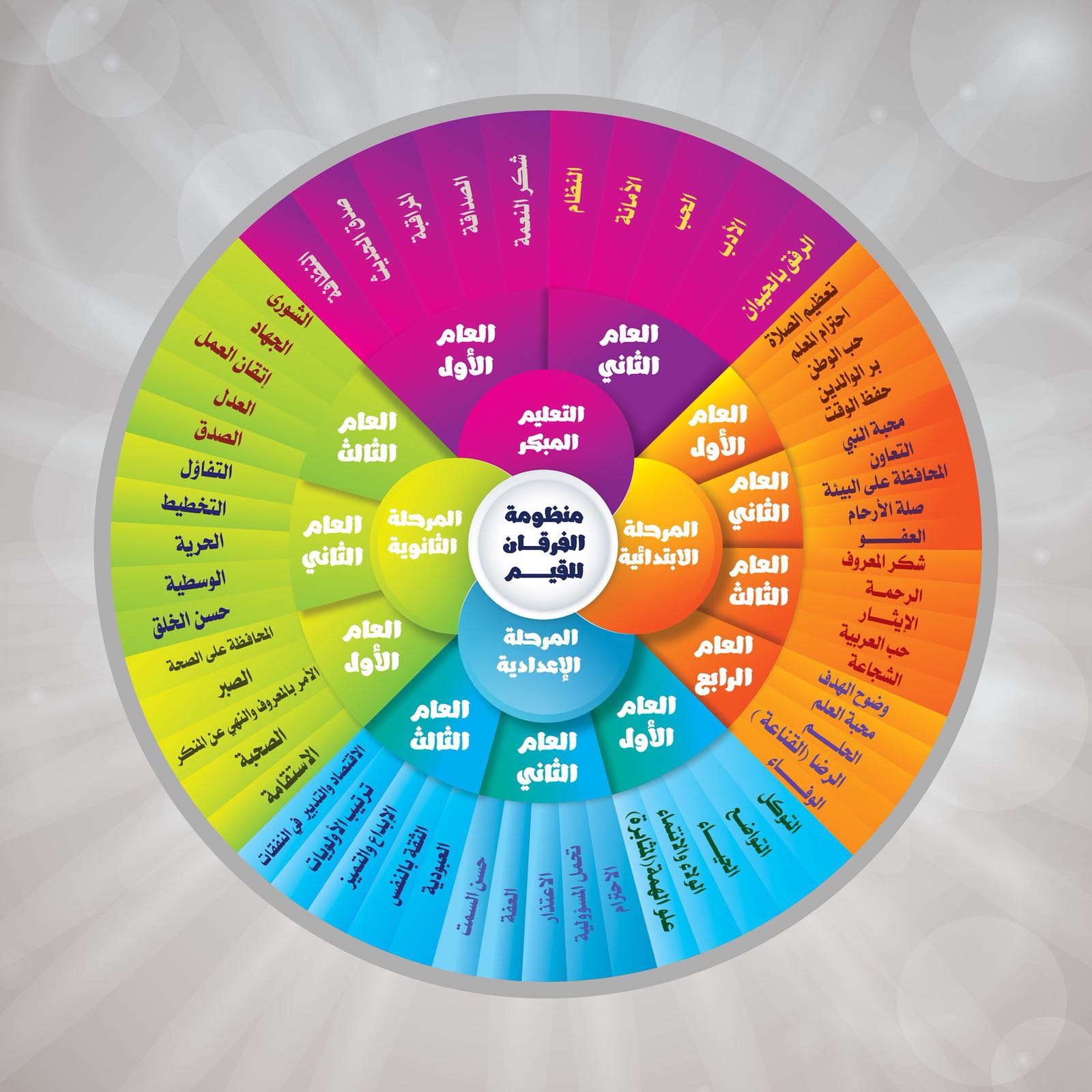 وتأتي منظومة الفرقان القيمية في ستين قيمة موزعة على المراحل الأربع بالمجمع التربوي :